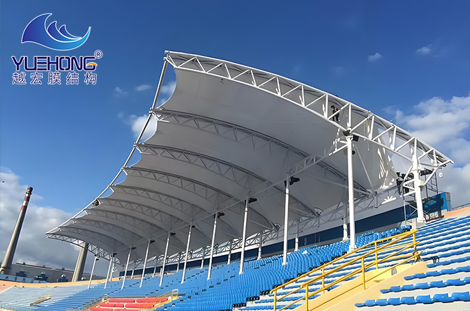 越宏膜結構廠家的廣州膜結構看臺是由鋼結構和膜材組成,分別有張拉式膜結構、索膜結構、骨架式膜結構、空間結構式等供選擇,根據不同場景進行設計出個性化膜結構。